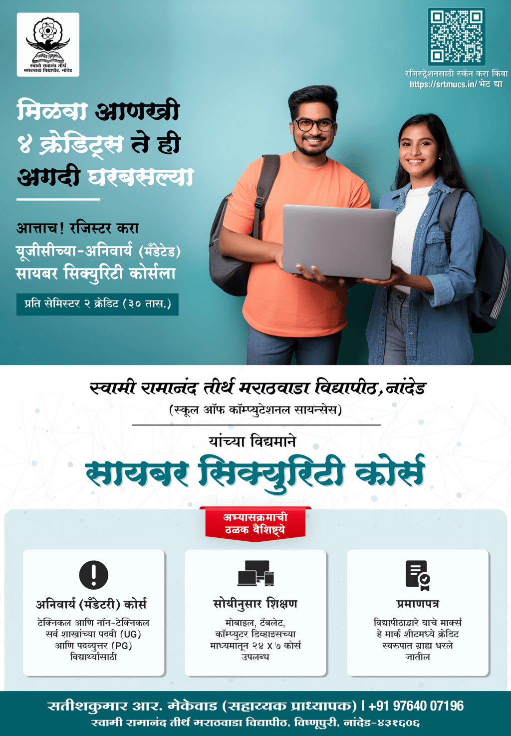 स्वा.रा.ती.म विद्यापीठाने एकीकडे विद्यार्थ्यांमध्ये नाविन्यपूर्णतेची तीव्र भावना आणि वैज्ञानिक दृष्टिकोन रुजवण्याची गरज आणि दुसरीकडे त्यांच्या कौशल्याला न्याय देणाऱ्या करिअरच्या व्यवहार्य संधी उपलब्ध करून देण्यात मोठी प्रगती केली आहे. या हेतूच्या पूर्ततेसाठीच स्वा.रा.ती.म विद्यापीठाने उद्योगांमध्ये प्रकर्षाने मागणी असलेले उदयोन्मुख स्किल्स सेट वितरित करण्यासाठी एक माध्यम म्हणून स्वतःला सादर केले आहे. अशा प्रकर्षाने मागणी असलेल्या कौशल्यांपैकी एक म्हणजे सायबर सुरक्षा हे एक कौशल्य आहे.